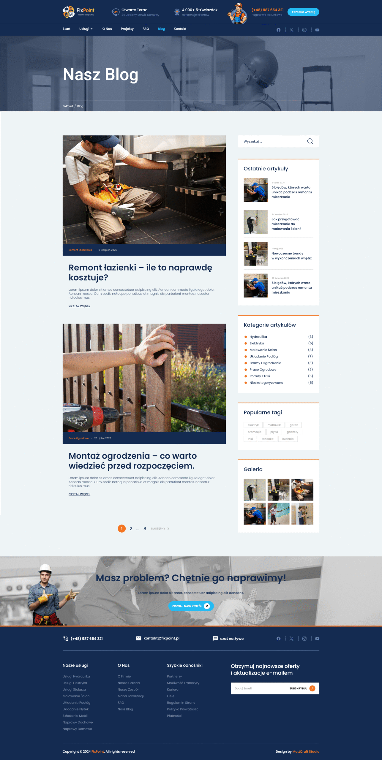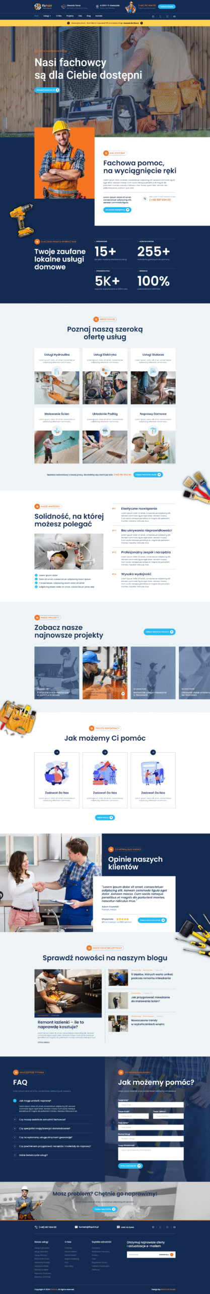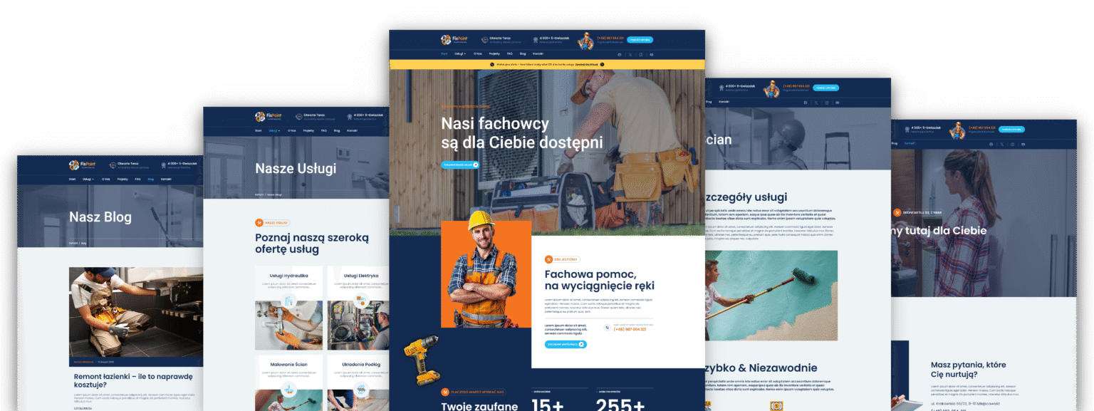 FisPoint to profesjonalny, w pełni responsywny szablon strony internetowej zaprojektowany z myślą o firmach z branży remontowo-budowlanej. Zawiera stronę główną oraz funkcjonalne podstrony: „O nas”, „Usługi”, „Projekty”, „FAQ”, „Blog” i „Kontakt”. Układ został zoptymalizowany pod kątem przejrzystości informacji oraz łatwego dostępu do kluczowych sekcji dla potencjalnych klientów.