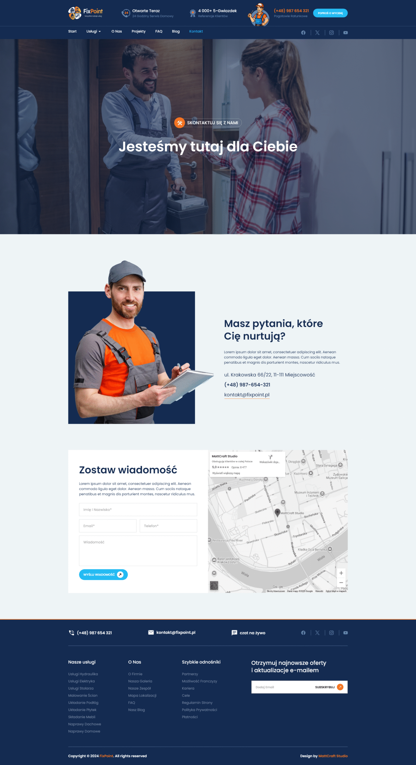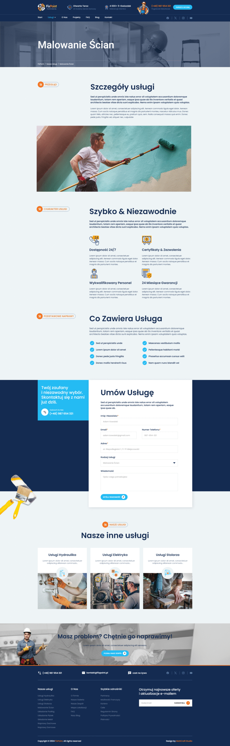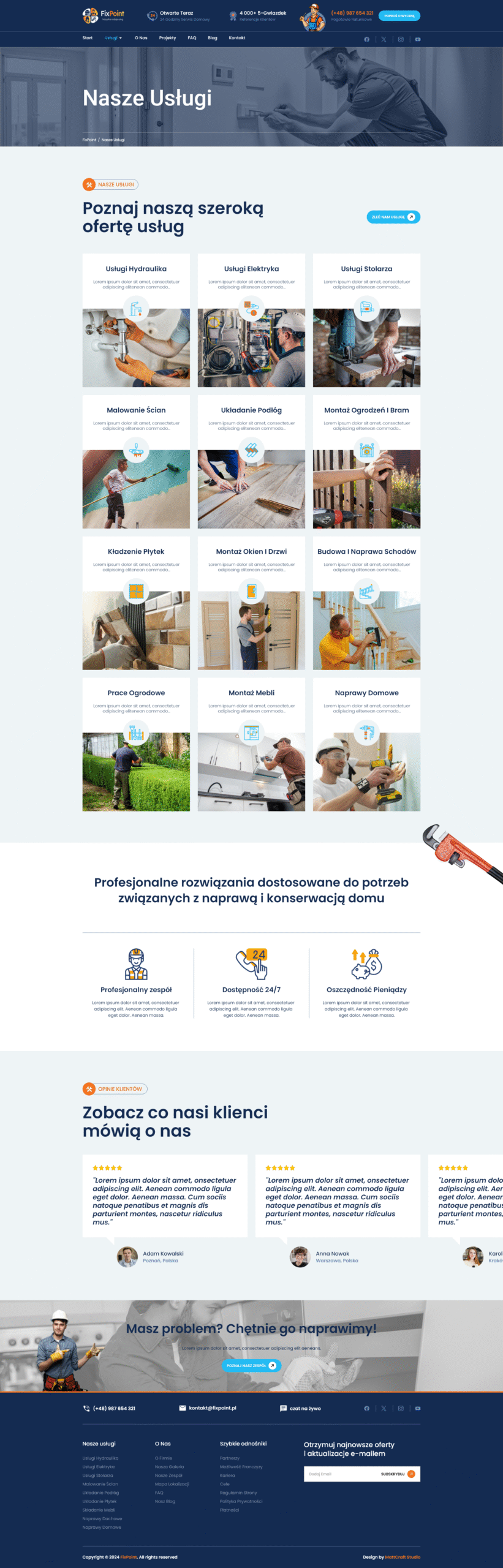 Projekt FixPoint to uniwersalny szablon, który doskonale sprawdzi się w branżach remontowo-budowlanej. Dzięki przemyślanej strukturze, klarownej komunikacji i nowoczesnej oprawie wizualnej stanowi gotową bazę do wdrożeń komercyjnych. Strona nie tylko prezentuje firmę jako eksperta, ale także przedstawia kompleksowo zakres świadczonych usług.